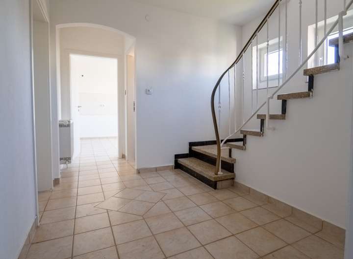 Über eine Treppe erreichen Sie das Obergeschoss: Das Hauptschlafzimmer ist großzügig und mit einem weiteren kleinen Raum verbunden. Hier kann Ihr Home-Office oder ein Ankleidezimmer entstehen. Ein großer Balkon ist von hier aus bequem begehbar. Der zweite Schlafraum eignet sich hervorragend als Kinderzimmer. Das Badezimmer ist hell gefliest und mit einer Badewanne ausgestattet.