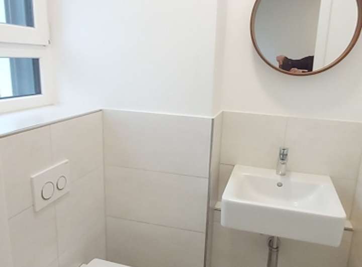 Im Eingangsbereich gleich rechts befindet sich das Tageslicht Gäste-WC mit Waschbecken.