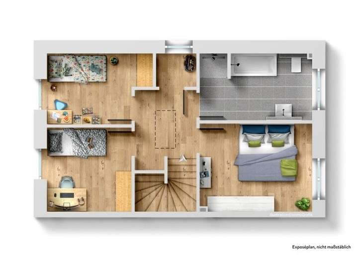 Der offene Wohn- und Essbereich mit Zugang zur Terrasse schafft ein freundliches Raumgefühl. Eine separate Küche, ein Gäste-WC sowie ein Hauswirtschaftsraum komplettieren das Erdgeschoss. Im Obergeschoss befinden sich drei Schlafzimmer und ein stilvolles Tageslichtbad mit Dusche und Badewanne. Der ausgebaute Dachboden bietet zusätzlichen Stauraum.