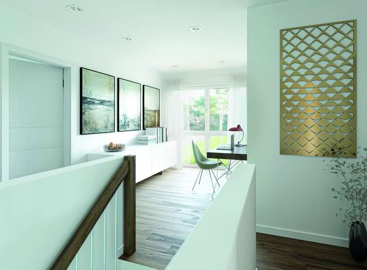 Elegant, modern und mit vielen frischen Ideen: So präsentiert sich dieses Fertighaus seinem Betrachter. Der quadratische Baukörper wird durch verschiedene Architektur-Features in Szene gesetzt. Blickfang auf der Gartenseite ist das Querhaus mit Pultdach, das einen interessanten Gegenpol zum klassischen Satteldach mit seinen weiten Dachüberständen bildet. Dank üppiger Verglasungen sorgt der Anbau in beiden Geschossen für ein großzügiges, lichtdurchflutetes Ambiente. An die Giebelseite des Hauses wurde eine designstarke Terrassenüberdachung angedockt. Unter ihr könnte beispielsweise ein gemütlicher Hängesitz Platz finden, in den sich an warmen Sommertagen nicht nur der Nachwuchs gern hineinlümmelt. Spritzige Akzente setzt die Farbgestaltung der Fassade: Der strahlend weiße Mineralputz wird kontrastiert mit dunkelgrauen Flächen. Wer mag, kann auch tiefer in den Farbkasten eintauchen. Wie wäre es beispielsweise mit einem sonnigen Gelb- oder einem natürlichen Braunton? Der Eingang liegt in diesem Planungsbeispiel auf der Giebelseite, er lässt sich aber auch auf die Traufseite verlegen. Der Grundriss ist perfekt auf den Tagesablauf einer vierköpfigen Familie abgestimmt. Offene Gemeinschaftsräume, gemütliche Privatbereiche für jeden Bewohner und multifunktionale Zonen vereinen sich zu einem harmonischen und alltagspraktischen Gesamtkonzept. Eine pfiffige Idee ist der Extra-Platz auf der Empore im Dachgeschoss, der sich vielseitig nutzen lässt. Die Bewohner können sich hier entweder ein luftiges Homeoffice mit Blick über den Garten oder eine schöne Spielecke für die Kinder mit Straßenteppich und Ritterburg einrichten. Hinzu kommen clevere Stauraumlösungen, von denen vor allem Familien bekanntlich nie genug haben können. So bietet der Windfang Stellfläche für einen großen Garderobenschrank, in dem sämtliche Jacken, Mäntel und Schuhe verschwinden. Größere Gegenstände wie die Skiausrüstung oder das Bobbycar der Kinder können im Technik- bzw. Hauswirtschaftsraum aufbewahrt werden. Und die Essensvorräte haben ihren Platz in der Speisekammer, die zwischen Eingang und Küche liegt. So kommt das Haus ganz ohne Keller aus.