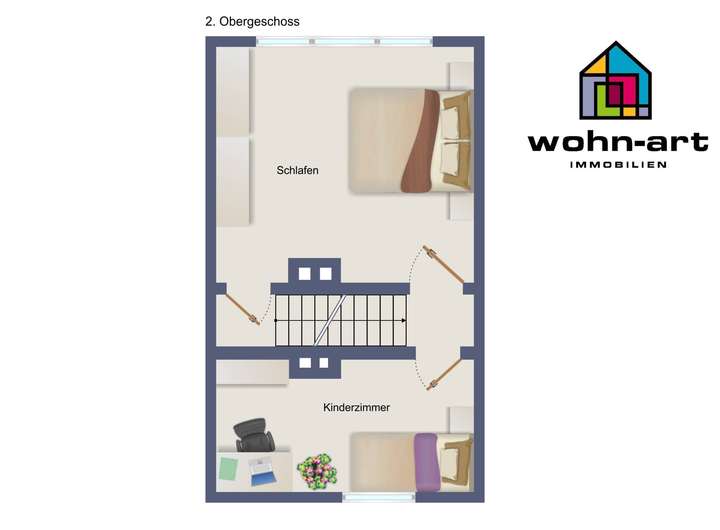 Im zweiten Obergeschoss liegen das Schlafzimmer, ein weiteres Kinder- oder Arbeitszimmer sowie ein separates WC. Der ausgebaute Dachboden bietet zusätzlichen Raum, etwa als Arbeits- oder Hobbybereich.