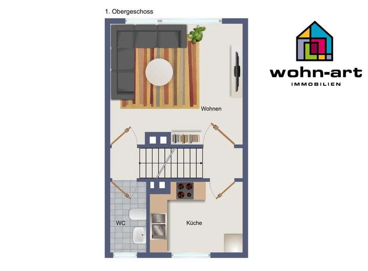 Das erste Obergeschoss bildet das Herzstück des Hauses: ein lichtdurchflutetes Wohnzimmer mit angrenzender Küche, die gemeinsam eine freundliche Wohnatmosphäre schaffen.