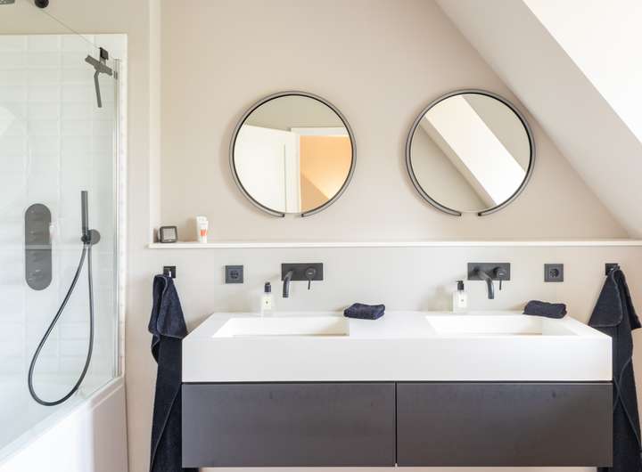 •Bad mit Duschwanne, spülrandlosem WC, modernen Doppelwaschtischen, schwarz-matte Armaturen