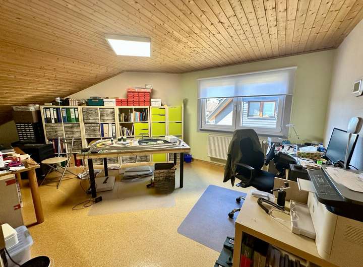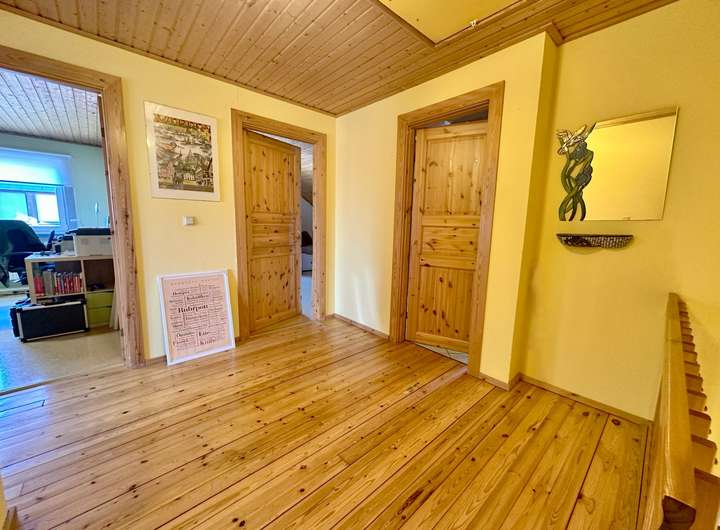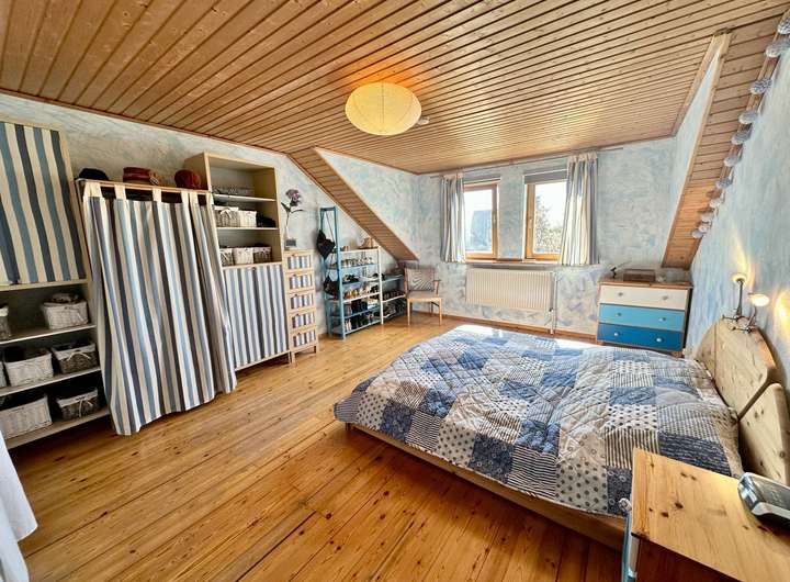 Im Obergeschoss befinden sich ein gemütliches Schlafzimmer sowie zwei weitere Zimmer, die sich ideal als Kinder-, Gäste- oder Arbeitszimmer nutzen lassen. Das helle Tageslichtbad ist