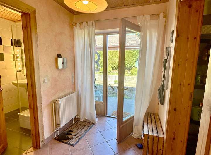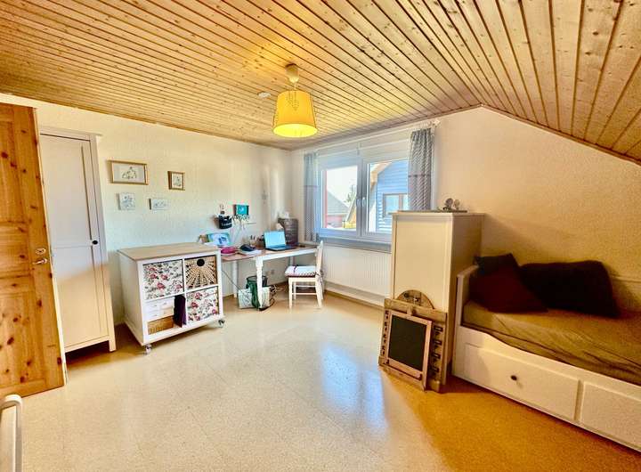 Im Erdgeschoss empfängt ein großzügiges Entrée Bewohner und Gäste mit einem offenen, luftigen Raumgefühl. Der offene Wohn- und Essbereich mit gemütlichem Kaminofen lädt zu entspannten Abenden ein und bietet direkten Zugang zum Garten. Die angrenzende geräumige Küche bietet viel Platz zum Kochen, Leben und Geniessen - ideal für alle, die gerne Gäste bewirten oder gemeinsam mit der Familie kochen. Ein modernes Gäste-WC mit Dusche sowie ein praktischer Hauswirtschaftsraum sorgen für zusätzlichen Komfort und Funktionalität im Alltag.