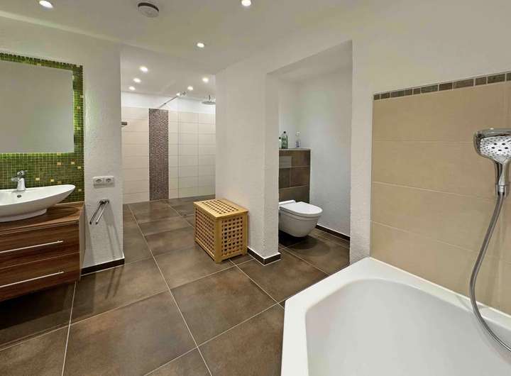 -Großzügiges Badezimmer ist mit Dusche und Badewanne ausgestattet