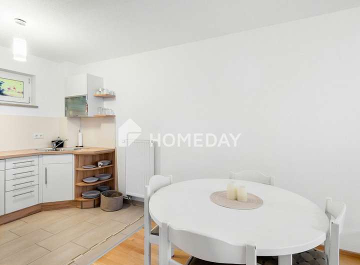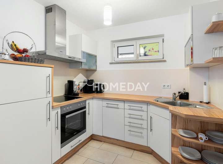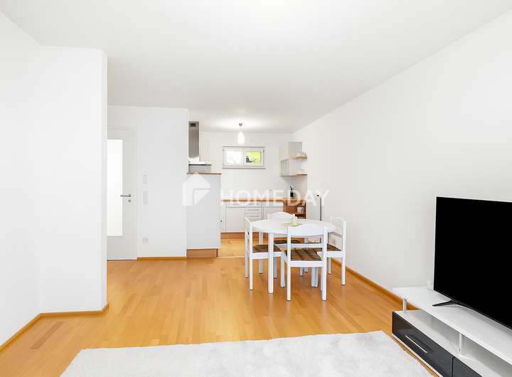 Der Mittelpunkt der Wohnung ist der offen gestaltete Wohn- und Essbereich mit integrierter Küche. Die moderne Einbauküche ist mit Elektrogeräten ausgestattet und fügt sich harmonisch in den Raum ein. Von hier aus genießen Sie einen freien Blick auf die angrenzende Terrasse und den Gartenbereich. Große, bodentiefe Fenster verbinden das Innere mit dem Außenbereich und sorgen für ein luftiges, helles Wohngefühl.