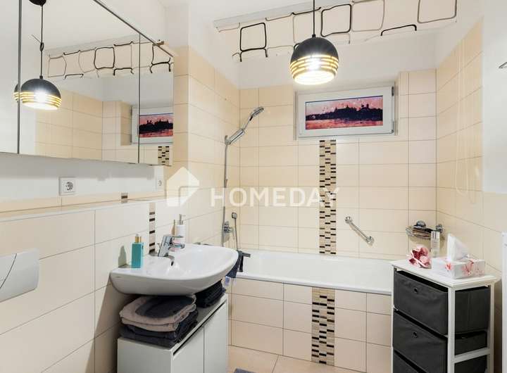 Schon beim Betreten der Wohnung empfängt Sie ein freundlicher Flur, von dem aus alle Räume bequem erreichbar sind. Gleich rechter Hand befindet sich das Tageslichtbad mit Badewanne – stilvoll gefliest und in einem sehr gepflegten Zustand. Der angrenzende Abstellraum bietet zusätzlichen Stauraum und sorgt so für Ordnung im Alltag.