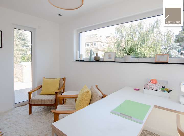 Mittelpunkt dieses wunderbaren Objektes bildet das großzugig geschnittene, helle Wohn- und Esszimmer mit viel Platz für einen großen Esstisch und einer gemütlichen Fernsehecke. Hier genießen Sie mit der ganzen Familie Ihr gemeinsames Sonntagsfrühstück. Die bodentiefen Fenster schaffen dabei eine wunderbare Wohlfühlatmosphäre und geben den Blick frei ins Grüne. Neben einem bequemen Zugang in den Garten bietet dieser Wohnbereich direkten Anschluss an die attraktive Küche.