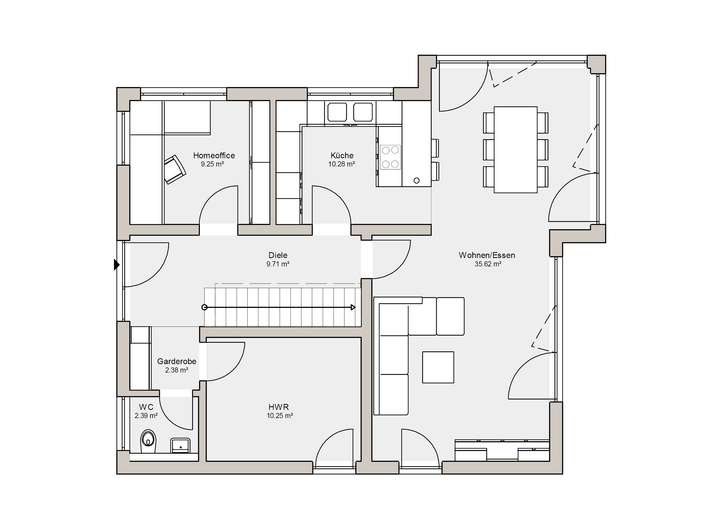 Wenn Sie die Diele des Architektenhauses Allea betreten, haben Sie Blick in den großen Wohn- und Essbereich. Durch bodentiefe Schiebeelemente ist dieser Bereich lichtdurchflutet und Sie können sowohl vom Sofa als auch vom Esstisch in den Garten schauen. Architektonisches Highlight des Familienhauses ist der Erker mit drei Fensterelementen, in dem das Esszimmer untergebracht ist. Die offene Küche grenzt direkt an das Esszimmer, ist aber auch von der Diele aus betretbar. Insgesamt umfassen Küche und Wohn-Essbereich mehr als 46 Quadratmeter. Im Erdgeschoss befinden sich zudem ein Home-Office, eine Garderobe sowie ein WC.