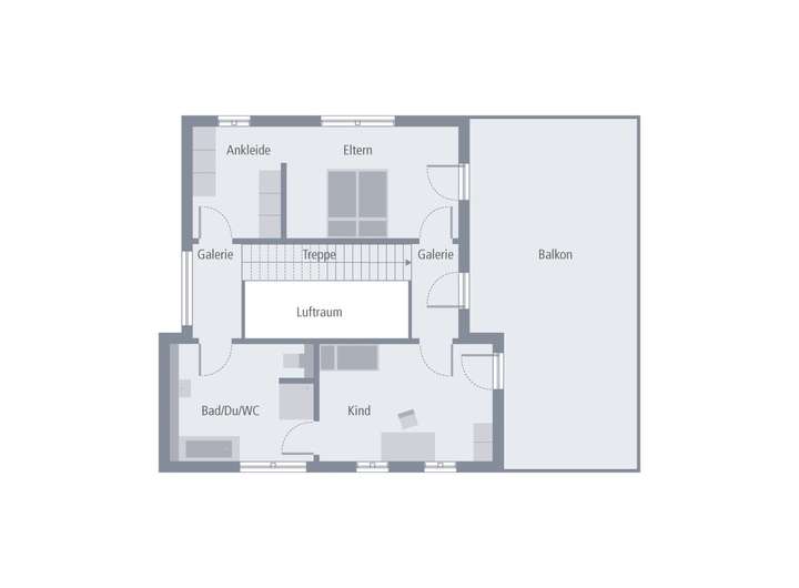 In der oberen Etage kann der vom Eltern- und Kinderzimmer zugängliche XXL-Balkon für ungestörte Sonnenstunden genutzt werden. Besonders durchdacht präsentieren sich auch die geteilte Galerie und das von zwei Seiten begehbare Badezimmer. Ein Grundriss, der seinesgleichen sucht.