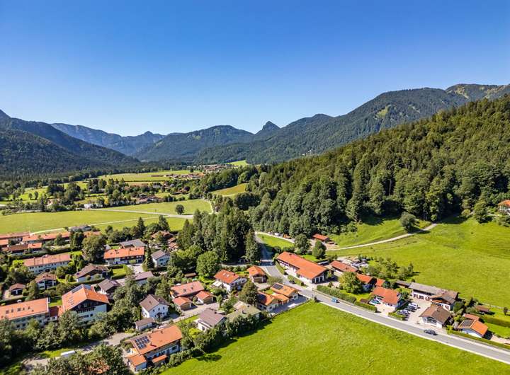 Im jungen Wohngebiet stehen überwiegend moderne Häuser. Von hier schaut man ins Kreuther Tal, sieht auf das Ringbergschloss, den Riederstein und Wallberg. Gleitschirmflieger vom Wallberg kucken runter und denken „Mei, die ham´s schön!“