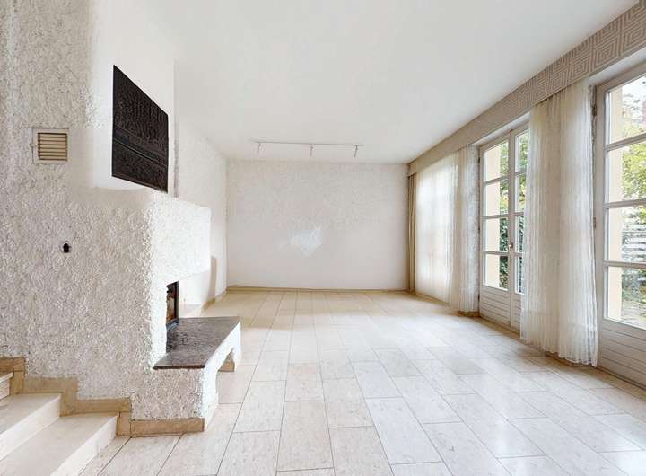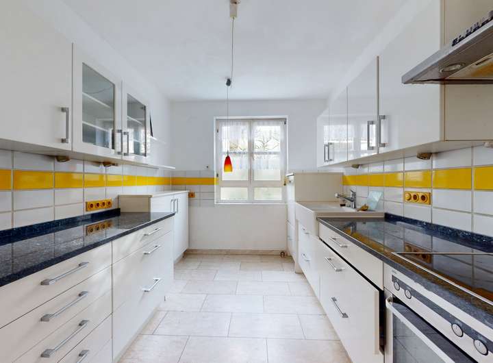 Der Wohn- und Essbereich im EG präsentiert sich hell, weitläufig und sonnenverwöhnt. Große Fensterflächen sorgen für eine angenehme Lichtdurchflutung und schaffen eine freundliche, einladende Wohnatmosphäre. An kühlen Tagen sorgt der gemütliche Kamin für zusätzliche Behaglichkeit. Die angrenzende Terrasse und der geschützte Gartenbereich bieten, trotz der zentralen Lage, ein hohes Maß an Privatsphäre und Ruhe.