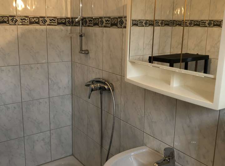 Das hell geflieste Duschbad verfügt über einen Waschtisch mit Chromarmaturen ein WC und einer Duschwanne. Ein kleines Fenster dient hier zur Be-und Entlüftung.