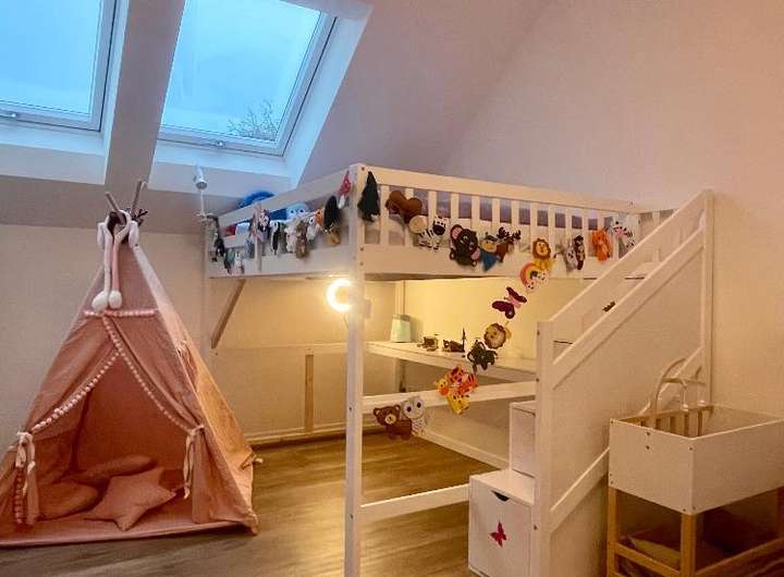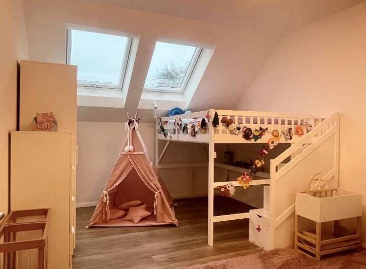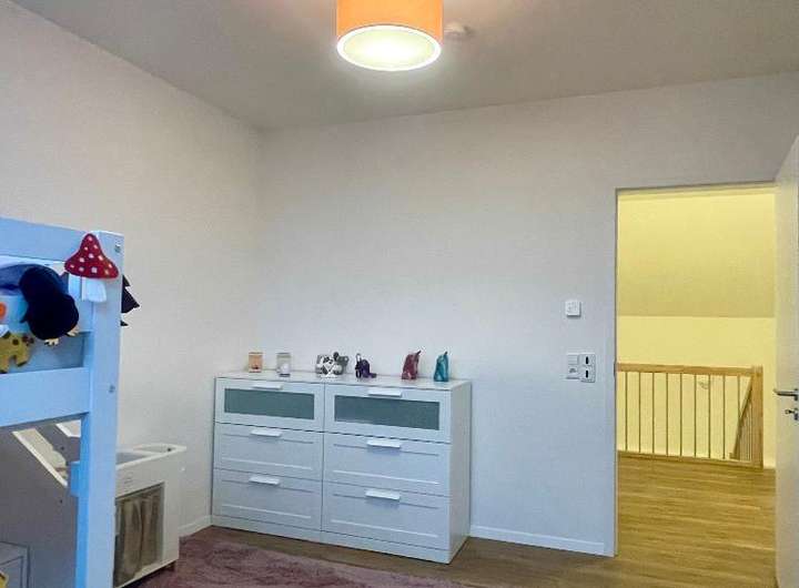 Die Raumhöhe beträgt 2,80 m und auch im Dachgeschoss ist aufgrund des erhöhten Kniestocks von 1,50 m genügend Platz für die Entfaltung / Einrichtung in den Kinder- und Schlafzimmern. Das Haus ist aufgrund der bodentiefen Fenster lichtdurchflutet und bietet künftig einen schönen Blick in den Garten. Zudem entspricht das Haus den Anforderungen von KfW55 und ist somit ernergiesparend.