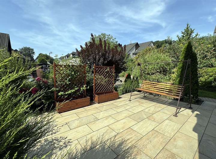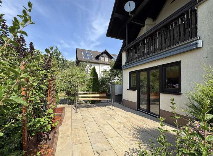 Von der Küche der Hauptwohnung gelangt man direkt auf eine großzügige, mit hochwertigem Natursteinzeug belegte Terrasse – ideal für gesellige Stunden im Freien. Sowohl die Hauptwohnung im Obergeschoss als auch die Einliegerwohnung verfügen über Balkone mit witterungsbeständigem Teakholzbelag. Das gepflegte Grundstück mit einer Fläche von ca. 550 m² bietet vielfältige Gestaltungsmöglichkeiten – ob für Blumenbeete, Gemüseanbau oder als Spielfläche für Kinder.
