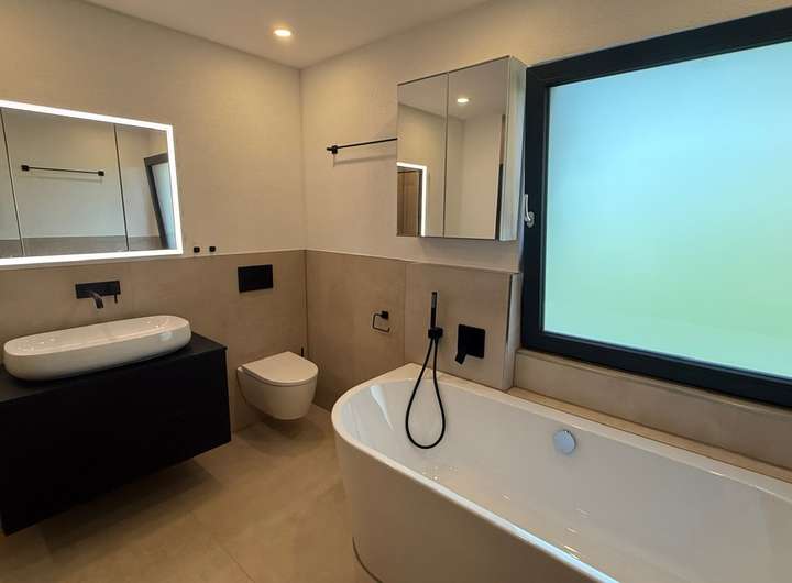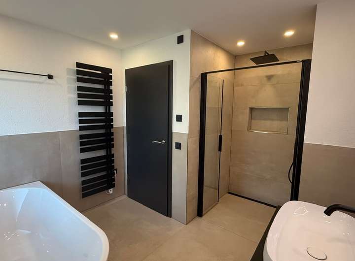 •Modernes Tageslichtbad mit bodengleicher Dusche, Wanne, Handtuchheizkörper, WC und Waschbecken