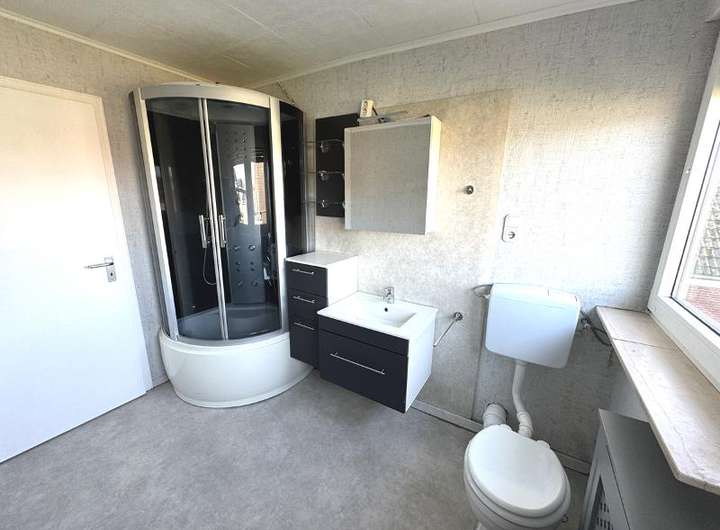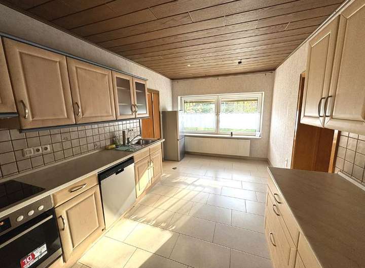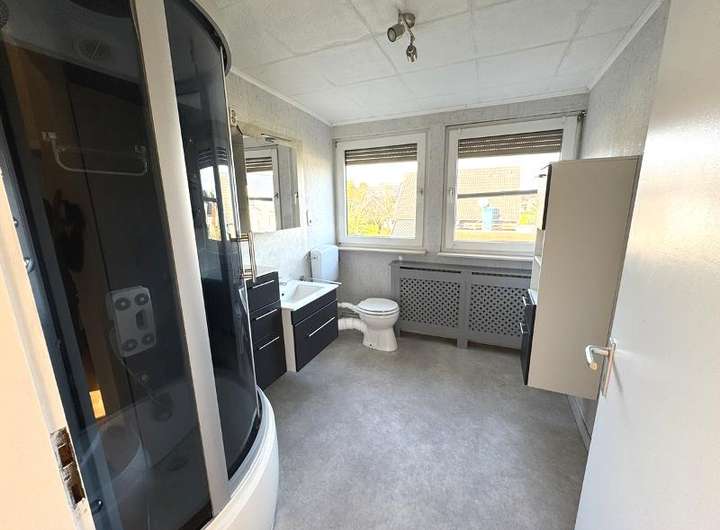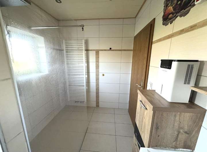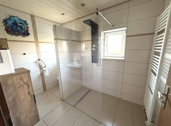 • Erdgeschoss: ca. 108 m², mit Einbauküche, saniertes Badezimmer mit ebenerdiger Dusche und teilweise neuen Bodenbelägen (Fliesen in Bad, Küche, Flur).