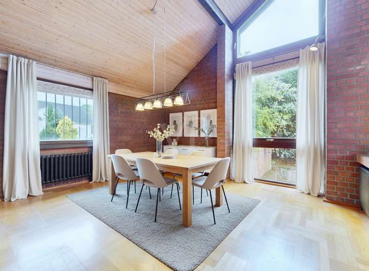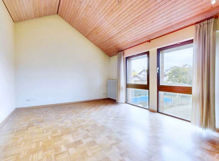 Auch in puncto Ausstattung und Technik weiß das Haus zu überzeugen: Es befindet sich insgesamt in einem guten und gepflegten Zustand, wobei in einigen Bereichen Raum für individuelle Modernisierungen besteht. Die Beheizung erfolgt über eine moderne, effiziente und umweltfreundliche Holzpelletheizung. Teilweise bodentiefe Fenster sorgen für viel Licht und eröffnen schöne Ausblicke ins weitläufige Grün rund ums Haus.