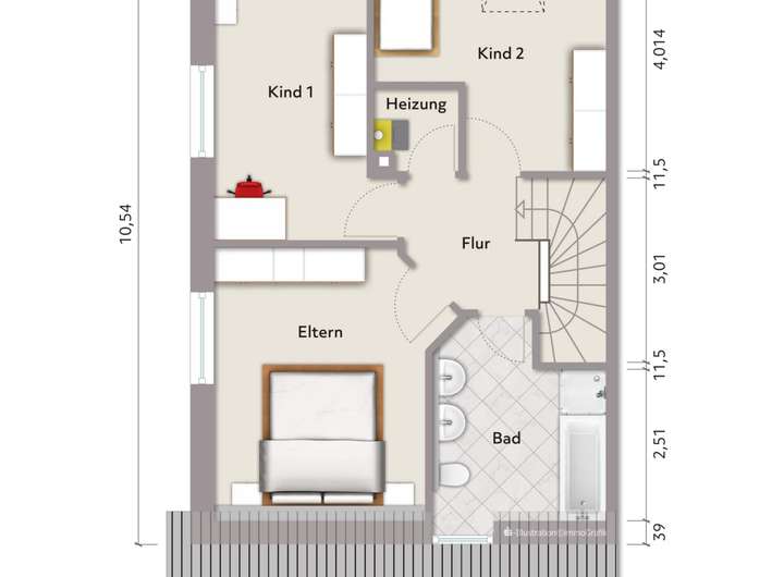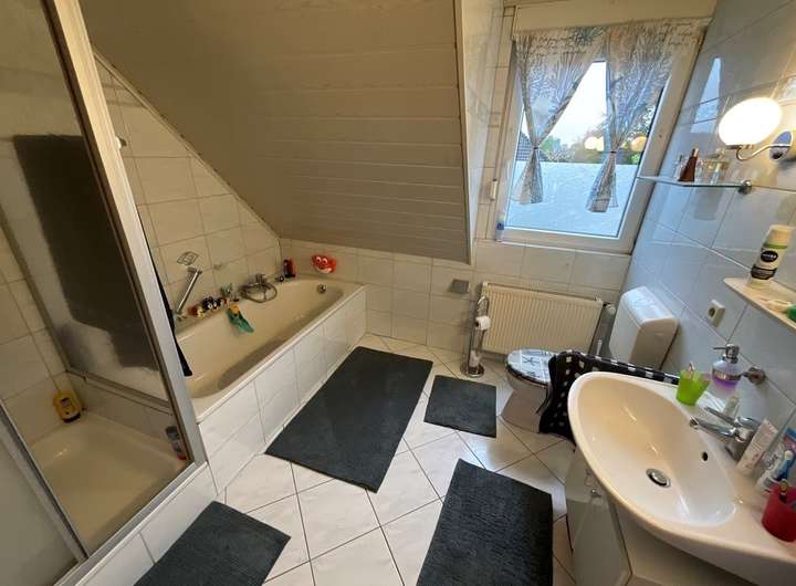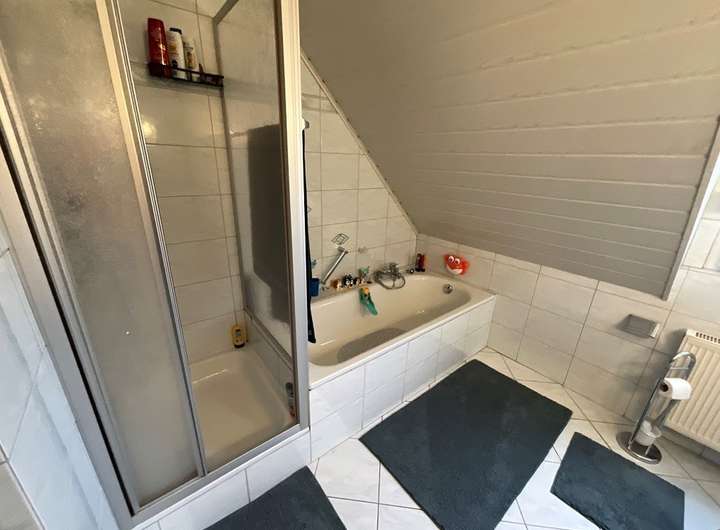 Im Dachgeschoss sind drei Schlafräume und ein Bad mit Wanne und Dusche. Der Spitzboden kann für Abstellflächen genutzt werden.