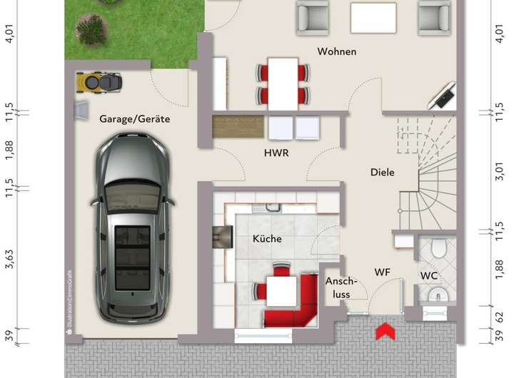 Diese Doppelhaushälfte in zentraler Wohnlage von Sögel ist eine ideale Immobilie für kleine Familien bzw. Paare oder Single mit großem Platzbedarf. Auf einer Wohnfläche von ca. 101 m² bietet das Haus eine geräumige Küche mit ausreichend Platz für die täglichen Mahlzeiten der Familie, ein geräumigen Wohn/ Esszimmer mit Zugang in den Garten bzw. auf die kleine überdachte Terrasse, ein Gäste-WC und der Flur mit der Treppe ins Dachgeschoss. Im Flur des Erdgeschosses finden die Garderobe oder eine Kommode ihren Platz. Waschmaschine und Trockner sind im Hauswirtschaftsraum untergebracht, der den Wohnteil des Hauses mit der Garage verbindet.
