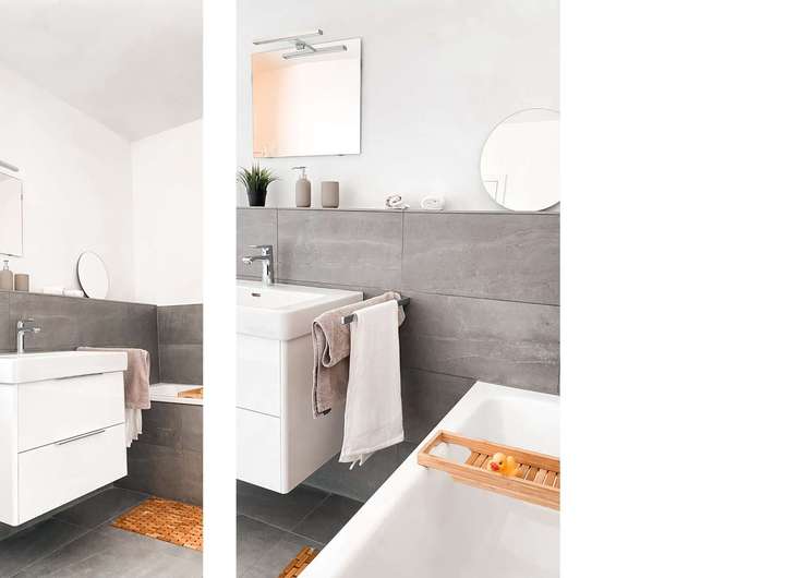 - Bodenfliesen in 60 x 60 cm und Wandfliesen in 30 x 60 cm