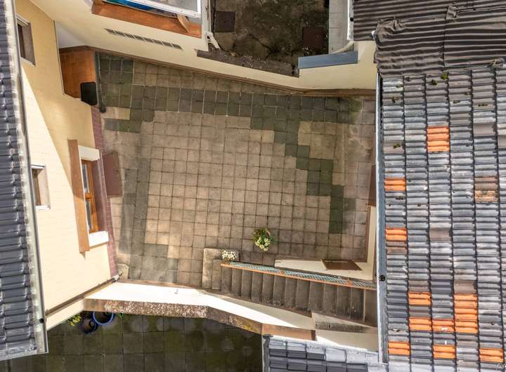 Die angebotene Immobilie ist eine unterkellerte Reihen-Doppelhaushälfte in Massivbauweise mit Innenhof und Nebengelass. Das Gebäude ist beidseitig angebaut und stammt aus der Zeit um 1900. Als Baumaterialien wurden erkennbar graue Betonsteine sowie Backsteine verwendet. Die Kellerdecke ist aus Beton gefertigt, während die Geschossdecken als klassische Holzbalkenlage ausgeführt sind. Insgesamt verfügt das Haus über zwei Vollgeschosse.
