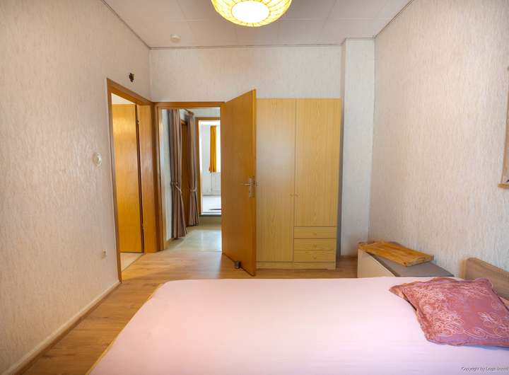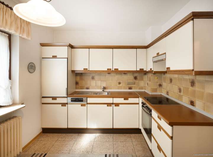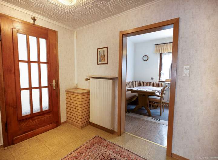 Die Wandoberflächen sind überwiegend mit Strukturtapeten versehen. In Bad und WC wurden Fliesen verwendet, in der Küche ist ein Fliesenspiegel angebracht. Als Bodenbeläge finden sich Linoleum in den Flurbereichen, Teppich und Laminat in Wohn- und Schlafräumen sowie Fliesen in den Sanitärräumen.