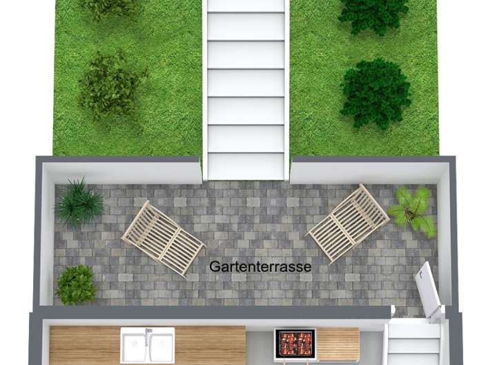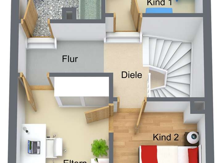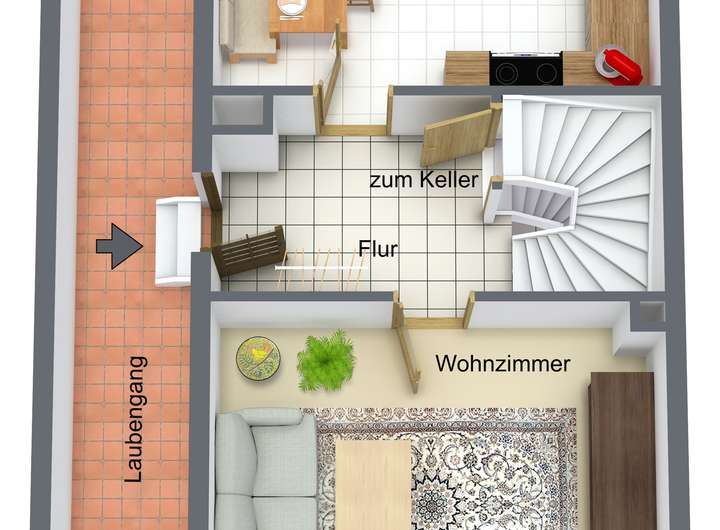Im Erdgeschoss wird der Eingang über einen geschützten Laubengang erreicht, der zugleich in den Innenhof führt. Von hier gelangt man zu einem WC, einem praktischen Mehrzweckraum sowie in das Atrium mit Treppe zur Freisitz-Empore. Der kompakte Flur im Hausinneren erschließt die Wohnküche, das gemütliche Wohnzimmer, den Keller und das Treppenhaus.