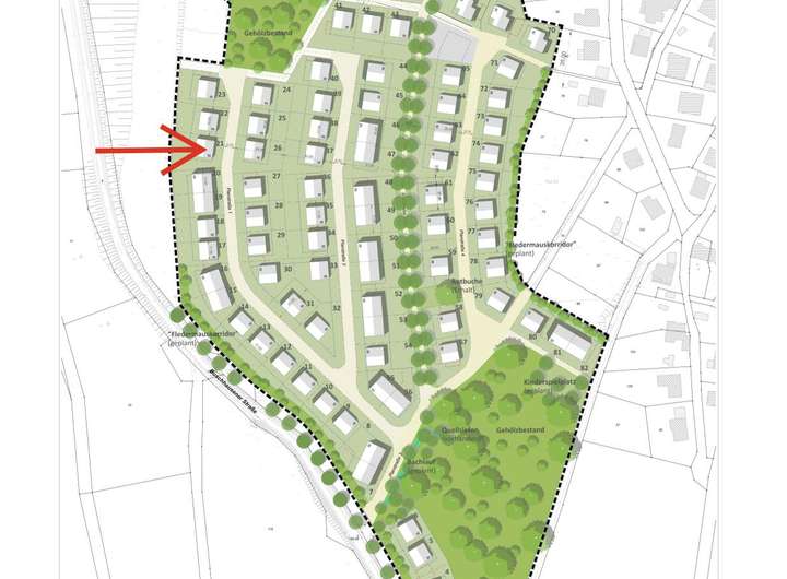 Das hier zum Verkauf angebotene Grundstück mit der Parzellennummer 21 umfasst 705 m² und liegt im westlichen Bereich des Neubaugebietes.