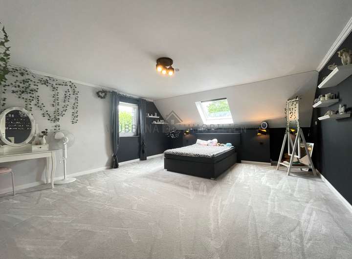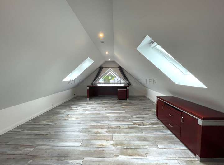 Im Obergeschoss erwarten Sie fünf gut geschnittene Zimmer und ein modernes Badezimmer mit Dusche. Der ausgebaute Dachboden erweitert das Raumangebot und bietet vielfältige Nutzungsmöglichkeiten, beispielsweise als Hobbyraum, Homeoffice oder Rückzugsort.