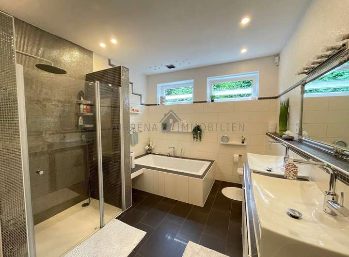 Ein stilvolles Tageslichtbad mit Dusche, Badewanne und gemauertem Doppelwaschtisch, ein Gäste-WC mit zusätzlicher Dusche, ein Schlafzimmer, ein Büro sowie ein Hauswirtschafts- und Heizungsraum komplettieren das Erdgeschoss.