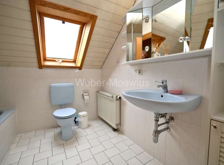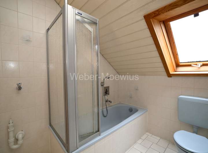 - 1 Tageslicht-Bad mit Wanne + Duschabtrennung, Waschbecken, WC im DG