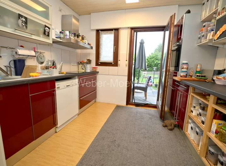 Die Erdgeschosswohnung bietet ca. 109 m² Wohnfläche und verfügt über 5 Zimmer, Küche, Bad, Gäste-WC, eine teilüberdachte Terrasse und den Garten.