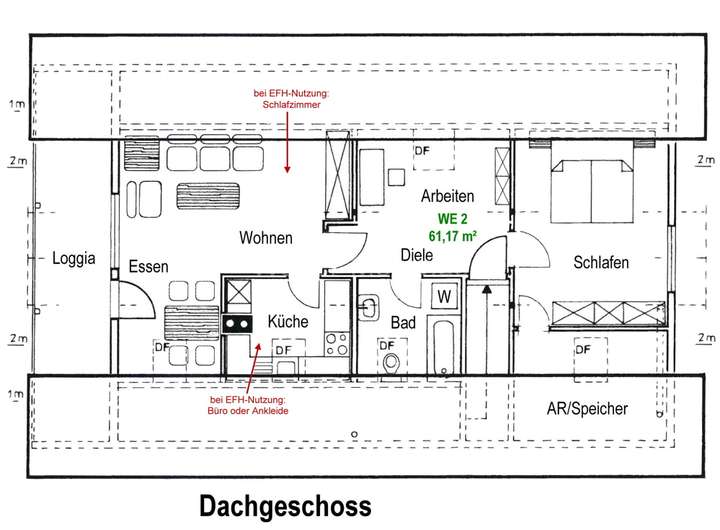 - bei Nutzung als EFH: 8 Zimmer + Hobbyraum + offener Arbeitsbereich im DG
