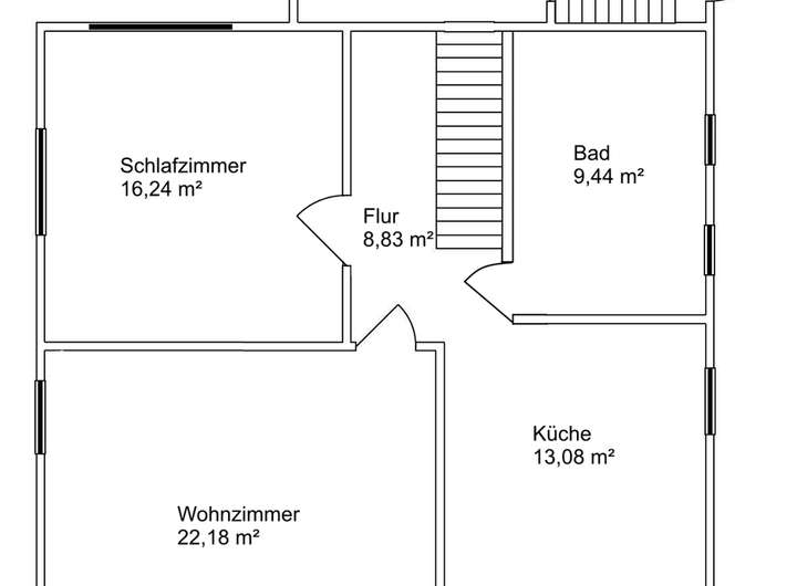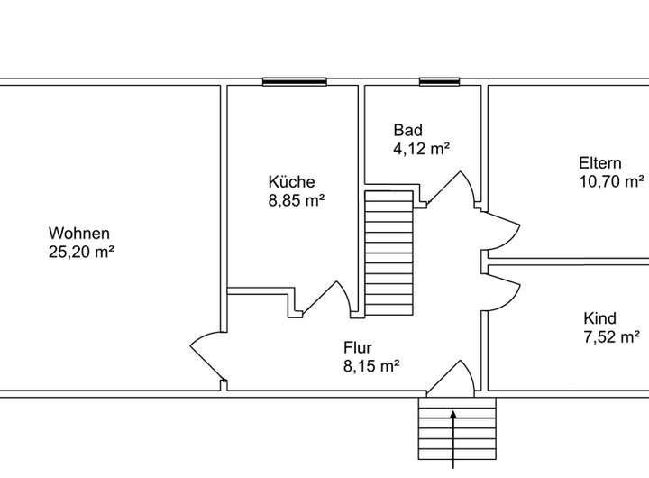 EG: Windfang, Flur, Treppenhaus, Schlafzimmer, Wohnzimmer, Küche, Bad