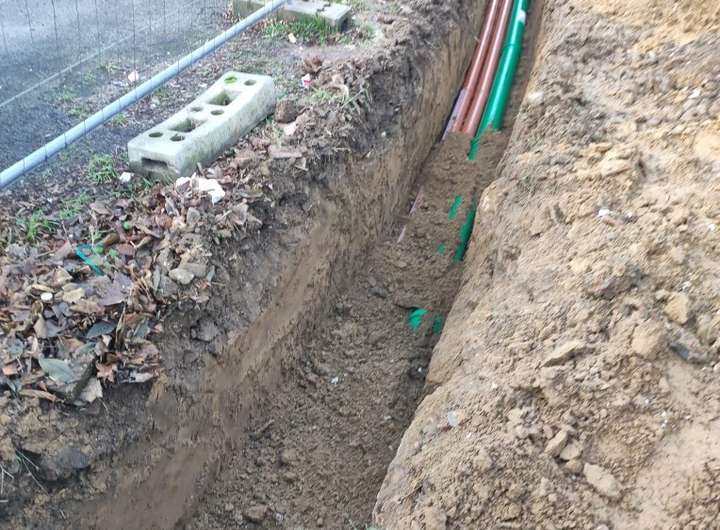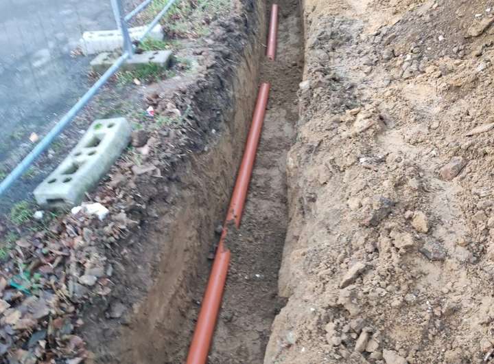 Das Grundstück besteht momentan noch aus 5 Parzellen (Flur 24, Nr. 183, 681, 969, 994 und 995), die miteinander vereinigt werden sollen. Weiterhin gehören jeweils ½-Anteile der Wegeflächen (Flur 24, Nr. 970, 971) zu den Grundstücken. Drei Leerrohre für Versorgungsleitungen und ein Abwasserkanal (grün) sind bereits verlegt (siehe Fotos). Es besteht die Verpflichtung die gemeinsame Wegefläche später zum Gehen und Fahren herzurichten. Die Kosten der Herstellung müssen zu ½ Anteil übernommen werden.