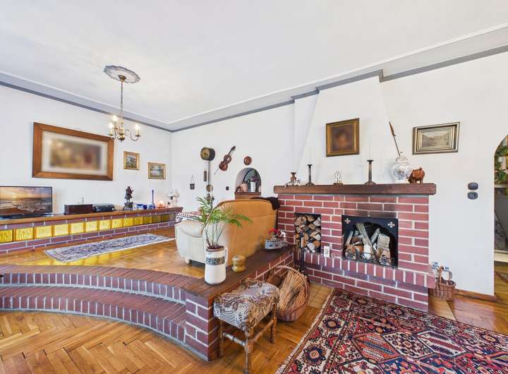 Im Inneren erwartet Sie eine wohnliche Atmosphäre. Der großzügig gestaltete Wohnbereich ist mit einem Kamin ausgestattet, der an kühleren Tagen für eine angenehme Wärme sorgt und einen besonderen Akzent setzt. Die Fußböden variieren je nach Raum mit Fliesen, Parkett und Teppichboden und fügen sich harmonisch in das Gesamtbild ein. Der Sanitärbereich ist funktional geplant und bietet alles, was für den täglichen Komfort erforderlich ist.