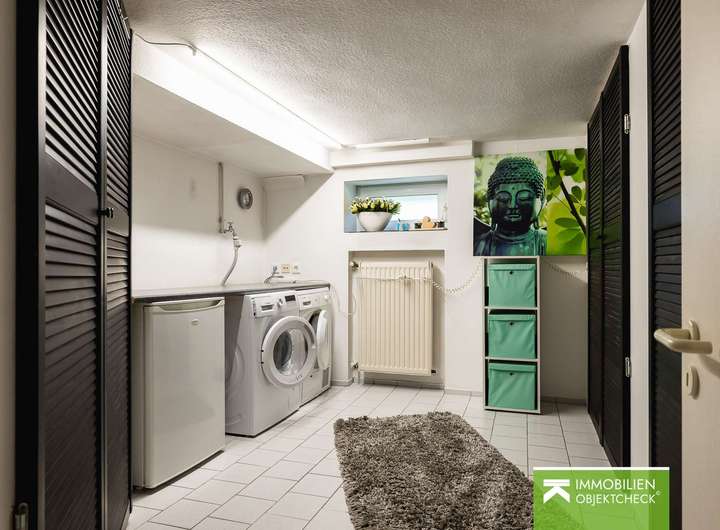 Das Kellergeschoss umfasst ca. 41 m² und bietet neben klassischen Keller-, Heizungs- und Lagerflächen zwei wohnlich nutzbare Räume mit angrenzendem Duschbad, kleiner Pantry-Küche und direktem Zugang zum Garten. Hier sind zahlreiche Nutzungsmöglichkeiten denkbar: Homeoffice, Hobby, Spielzimmer, Fitness, Musik usw. Bitte beachten Sie, dass diese Flächen nicht zur Wohnfläche zählen.