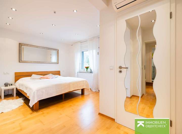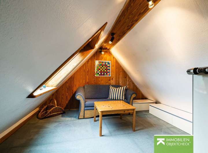 Im Erdgeschoss befinden sich das Wohnzimmer, das Esszimmer, die Wohnküche, ein Gäste-WC sowie ein heller Eingangs-/Dielenbereich. Das Obergeschoss bietet zwei weitere Zimmer – aufgeteilt in Schlaf- und Kinderzimmer – sowie ein Duschbad. Das Elternschlafzimmer ist mit einer komfortablen Klimaanlage und einem kleinen Ankleidebereich ausgestattet; zudem grenzt ein Bad en Suite mit großer Eckbadewanne an. Der Spitzboden ist mit rund 24 m² Nutzfläche wohnlich ausgebaut und komfortabel über eine fest verbaute Treppe zugänglich.