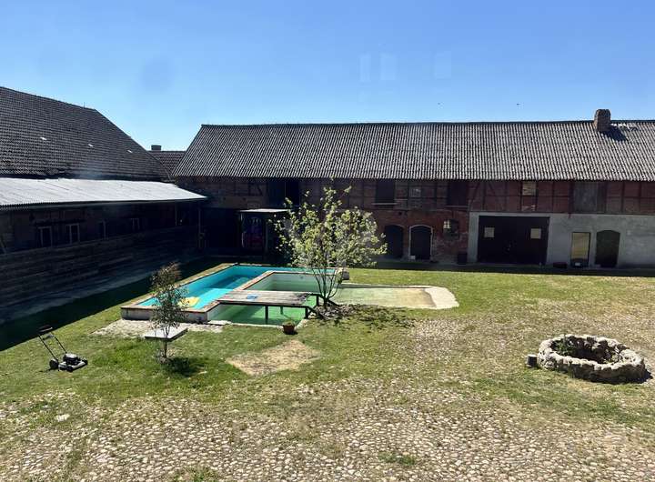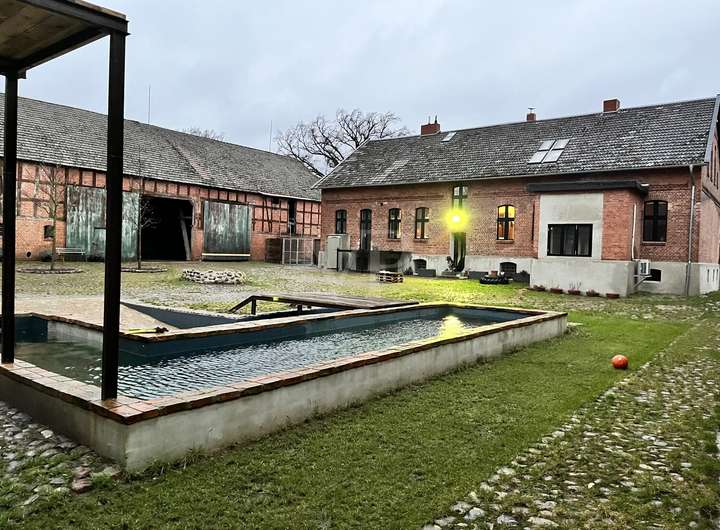 Der gesamte Innenhof hat eine Größe von ca. 1000 m² und ist mit Feldsteinen gepflastert. Hier wurde eine Ruheoase geschaffen mit zwei Pools (einer davon mit 3 m Tiefe und Sprungturm und der andere mit Rampe). Beide Pools haben getrennte Wasserkreisläufe und sind beheizbar, die Technik allerdings müsste neu installiert werden.