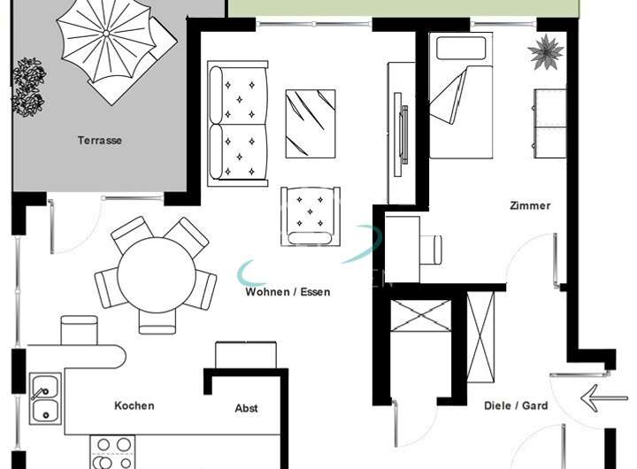 Der lichtdurchflutete Wohn- und Essbereich mit offener Küche bildet das Herzstück dieser Wohnung. Dank der bodentiefen Fenster genießen Sie hier den ganzen Tag über ein helles, freundliches Ambiente. Von hier aus betreten Sie die großzügige Terrasse mit angrenzendem Gartenbereich – teils überdacht, teils offen – und einer stilvollen Pergola, die zum Entspannen, Sonnen und Verweilen einlädt. Ein Ort, an dem Sie Sommerabende genießen oder einfach die Seele baumeln lassen können.