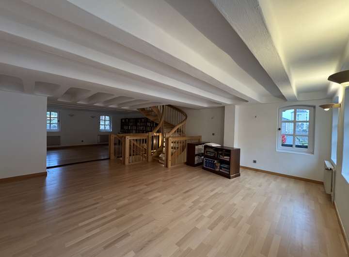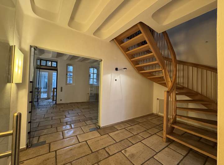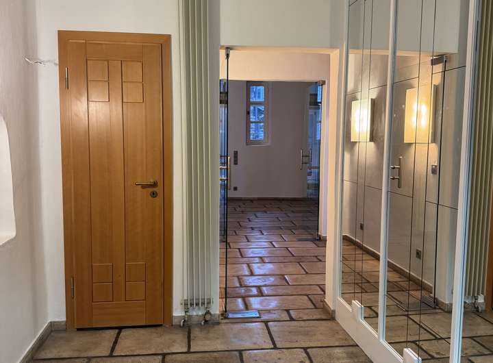 Der Innenbereich besticht durch hochwertige Materialien. Edles Naturstein im Erdgeschoss und Parkett, sowie Laminat in den oberen Etagen, verleihen den Räumen Wärme und Stil.