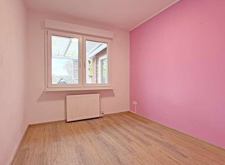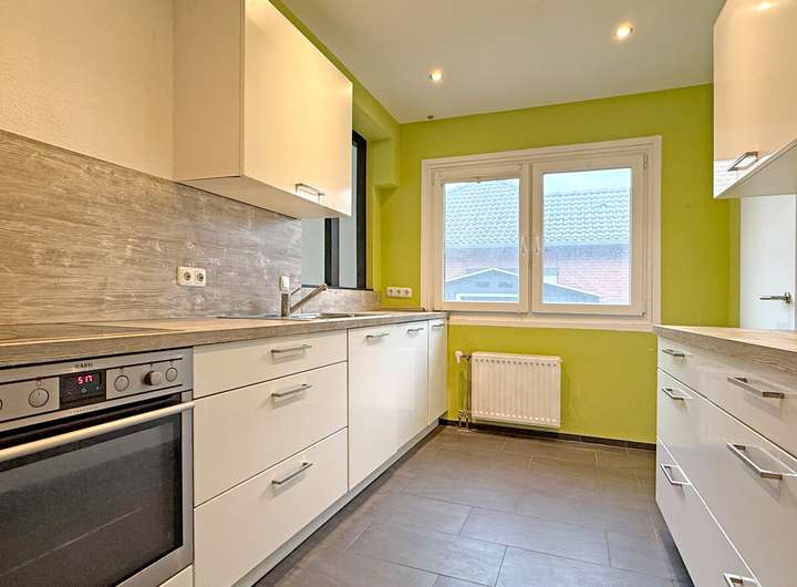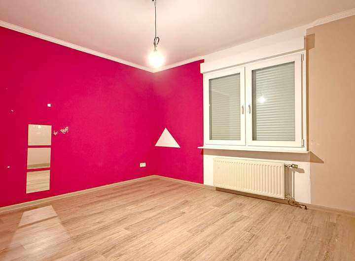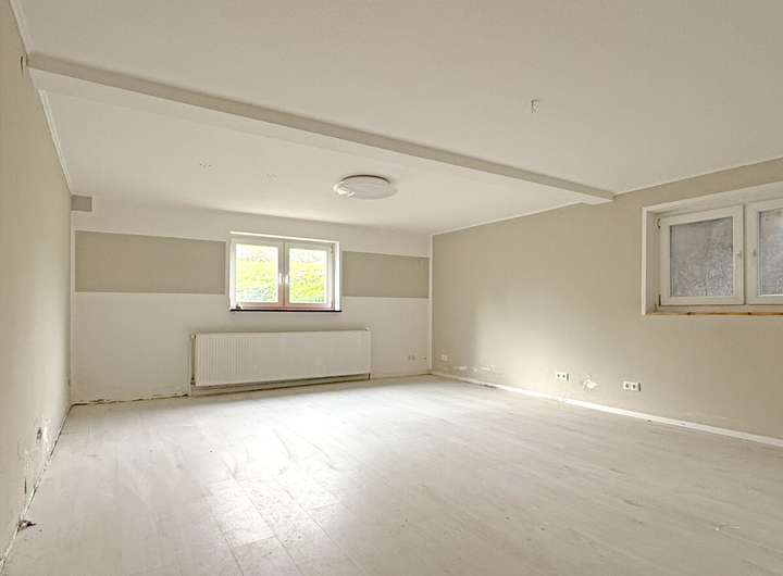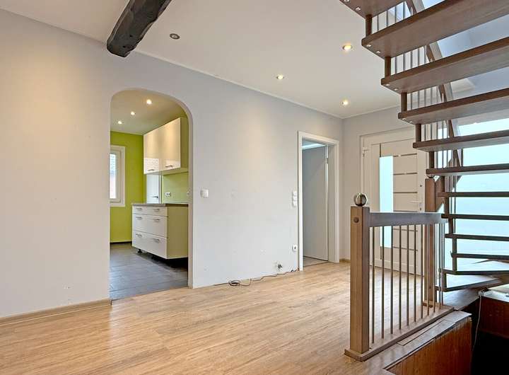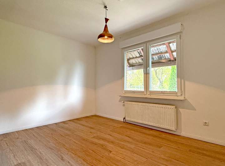 Die Küche ist funktional gestaltet und bietet ausreichend Platz für kulinarische Entfaltungen. Sie grenzt direkt an den Essbereich, was den Alltag erleichtert und gesellige Abende mit Familie und Freunden fördert. Die Zimmer im Erdgeschoss sind hell und freundlich, mit großen Fenstern, die viel Tageslicht hereinlassen.