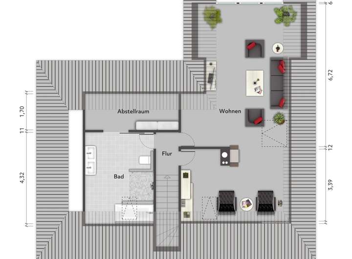 Der Außenbereich bietet mit seinem weitläufigen Garten zahlreiche Möglichkeiten zur individuellen Gestaltung und ist ideal für Familien mit Kindern. Eine überdachte Terrasse erweitert den Wohnraum nach draußen und bietet einen perfekten Platz für sommerliche Grillabende.