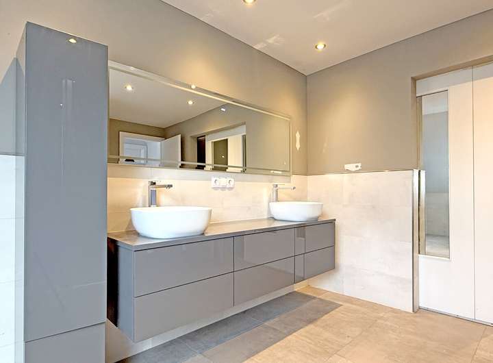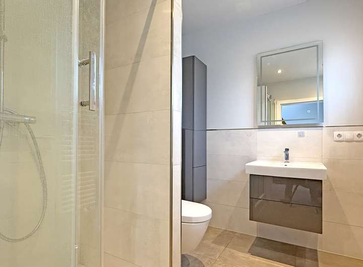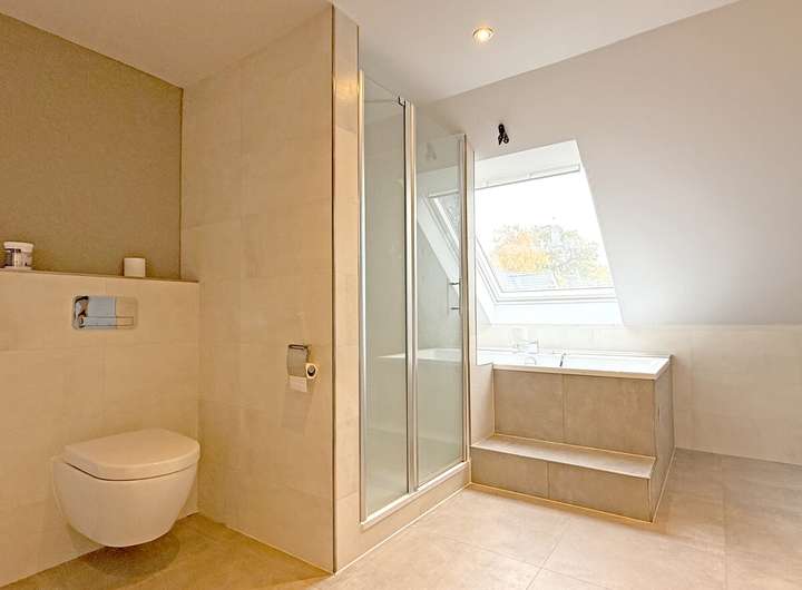 Im Obergeschoss finden Sie das Hauptschlafzimmer sowie weitere Räume, die flexibel als Kinderzimmer, Büro oder Gästezimmer genutzt werden können. Ein besonderes Highlight ist das moderne Badezimmer mit einer großzügigen Dusche und einer Badewanne, die zum Entspannen einlädt.