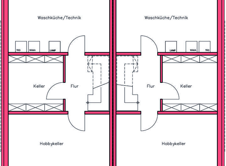 Der große Hobbykeller im Untergeschoss ist vielseitig nutzbar und wird mit Lichtschacht im Wohnraumstandard ausgebaut. Nebenan sind der Kellerraum sowie Waschküche/Technikraum vorgesehen.