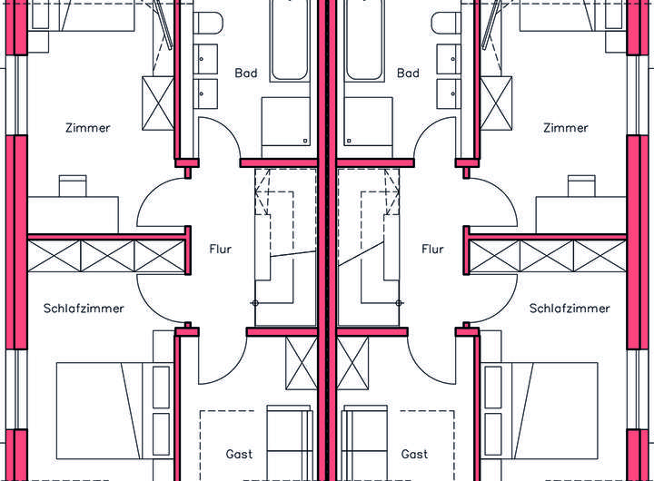 2 Schlafzimmer sowie ein Gäste-/Homeoffice-Zimmer haben wir im Obergeschoss für Sie geplant. Nebenan befindet sich das moderne Tageslichtbad mit bodengleicher Dusche, Wanne, WC und zwei Waschbecken.