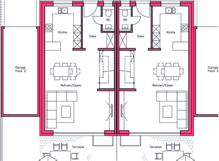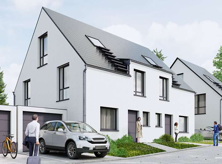 Das Haus ist komplett bezugsfertig geplant. Alle Bodenbeläge und Malerarbeiten sind im Preis enthalten. Die DHH wird in sehr guter Massivbauweise (Stein auf Stein) mit 3-fach Verglasung, Parkettboden, elektrischen Rollläden, Fußbodenheizung, Luft-Wasser-Wärmepumpe und Photovoltaik-Anlage nach GEG 2024 erstellt. Energieeffizienzklasse A+.