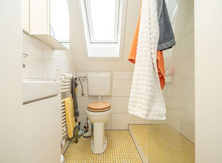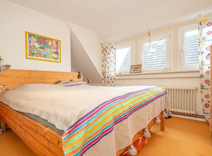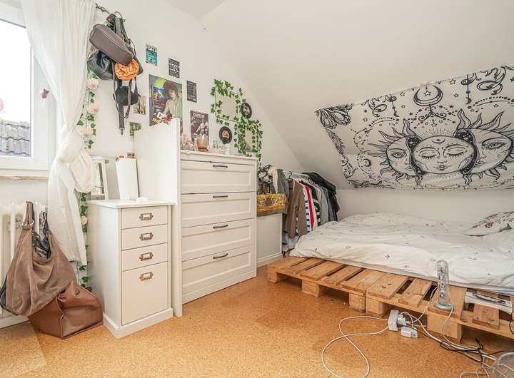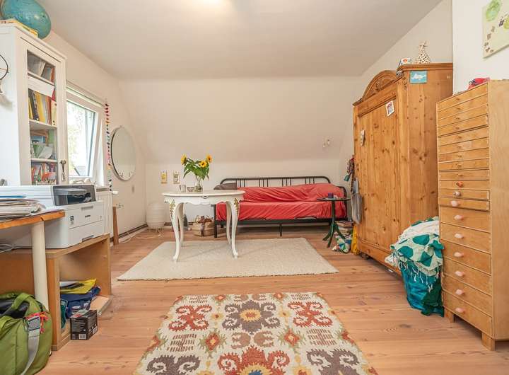 Im Dachgeschoss befinden sich zwei Schlafzimmer und ein weiterer Raum, der vielseitig nutzbar ist. Der Anbau aus dem Jahr 1964 bietet im Erdgeschoss ein Wohnzimmer und eine Küche; im Dachgeschoss ergänzen zwei Schlafzimmer sowie ein Badezimmer die Wohnfläche.